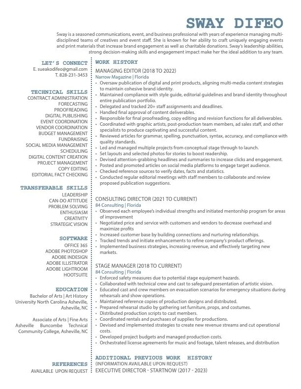Sway DiFeo is a seasoned communications, event, writing, and business professional with years of experience managing multi-disciplined teams of creatives and event staff.